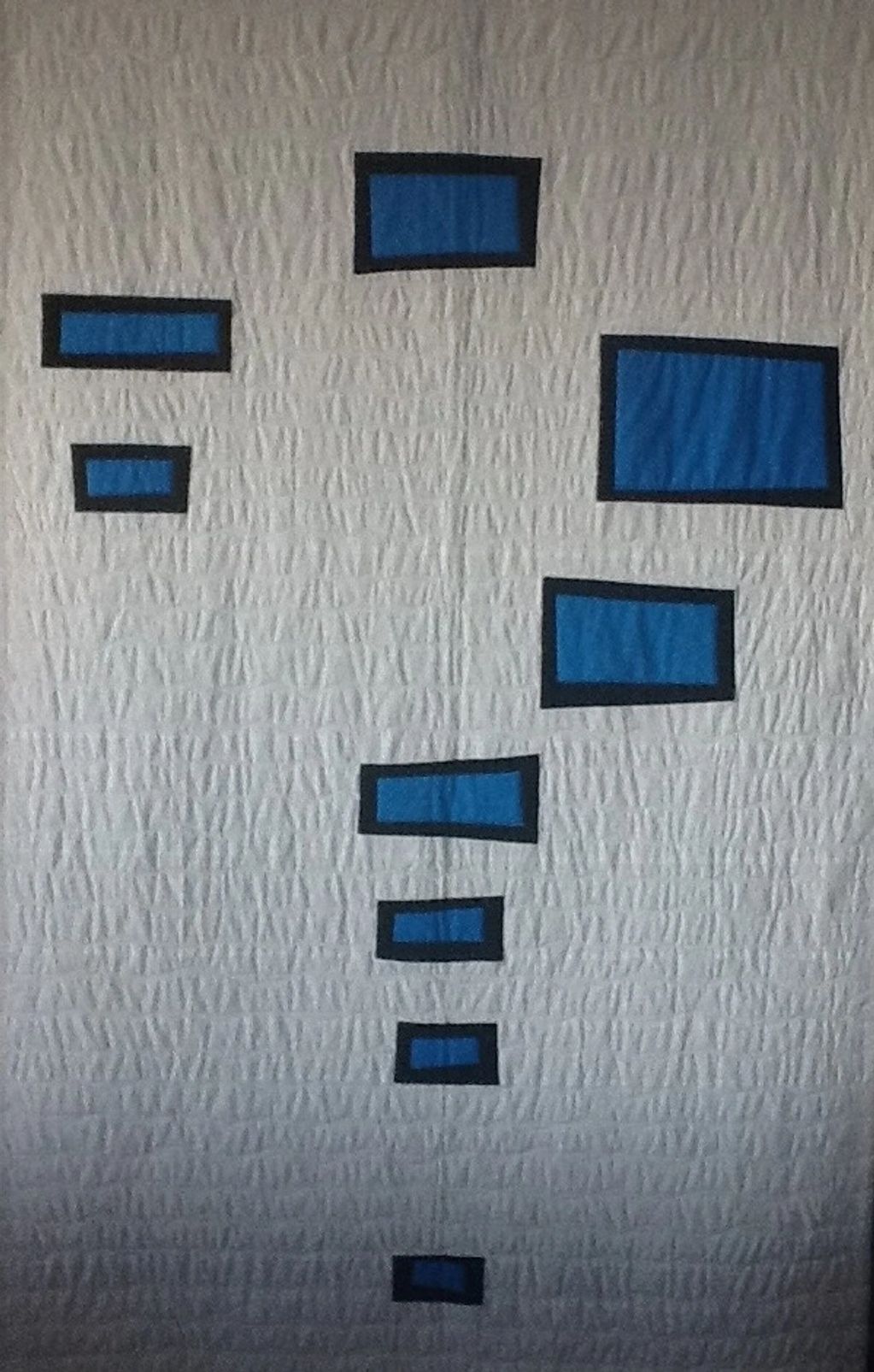 The Blue represents the Union Army. The Gray represents the Confederate Army. I wanted to create a piece that could reflect the division of soldiers during the Civil War. Families located between these two factions often had sons who fought against each other. This piece started with 16 colors of fabrics for a total of 120". It was sliced and stitched to its current size.